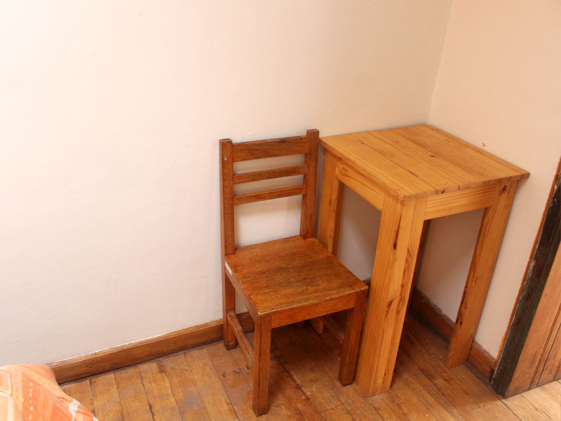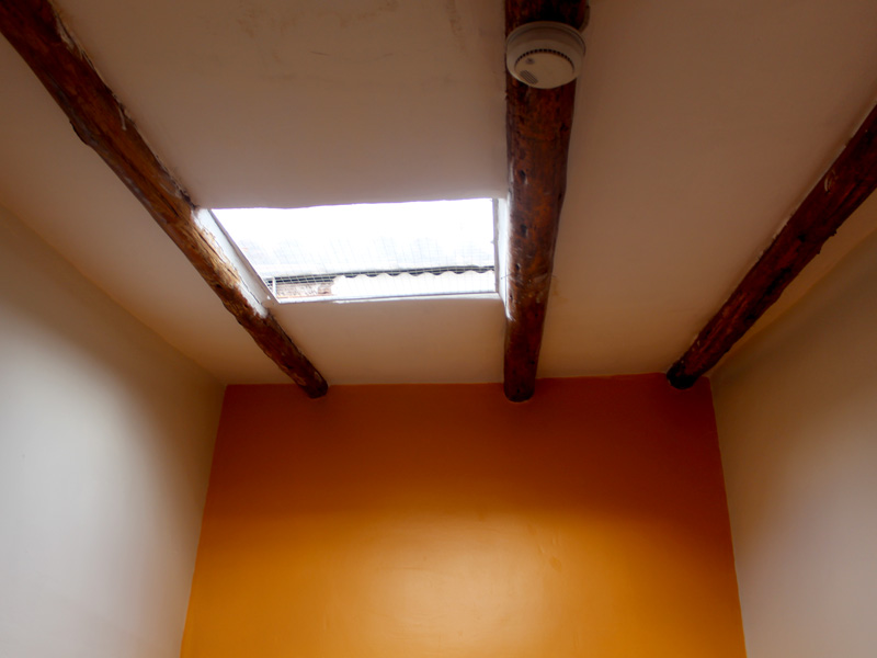 Habitación matrimonial, tragaluz en el techo, suelo de madera, una silla y mesa pequeñas, ideal para un ambiente sencillo y acogedor.